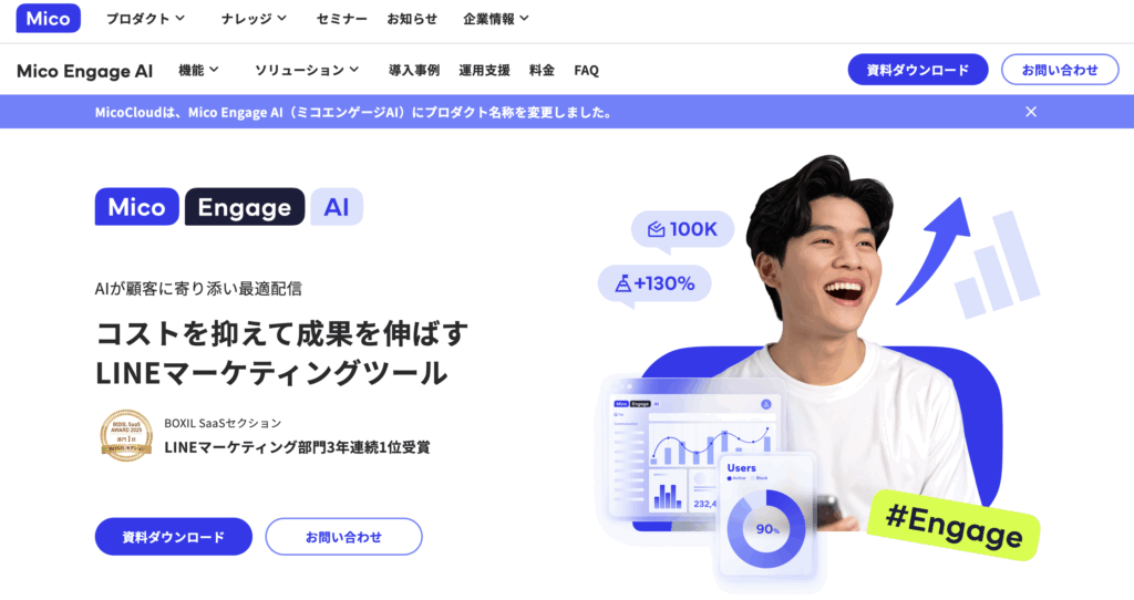 100種類を超えるテンプレートを活用することで短期間で業種別シナリオを実装でき、広告経由ユーザーを資産化する再配信シナリオでLTV向上を図ります。成果課金とハンズオフ運用が高く評価され、新たな施策をリスクなく試したい企業から支持を集めています。