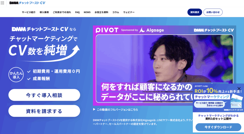 料金はROASに連動した成果単価のみで、初期費用や運用費はかからず、モバイル月間PV5万以上を目安に導入できます。会話ログとCVRを分析して改善提案を行い、QR連携によりオフライン購買計測やCRMへの自動同期にも対応します。