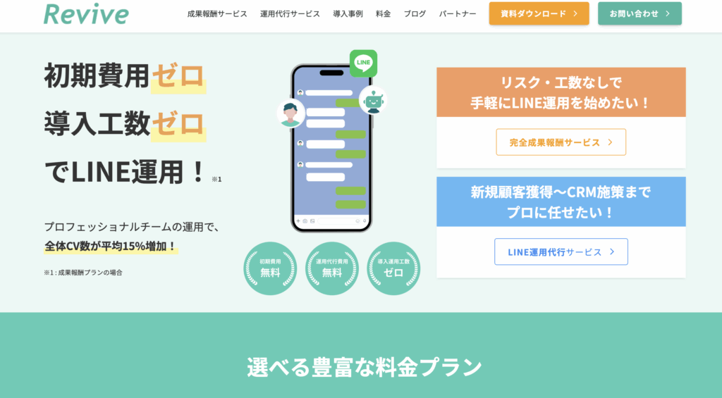 Reviveは完全成果報酬型のLINEマーケティングサービス「Revive CV」を提供しており、サイトから離脱しそうなユーザーをポップアップでLINEへ誘導し、チャットボットの対話によってCVを獲得します。導入実績は累計300社以上、利用継続率は97%を誇り、ディレクター・シナリオライター・デザイナーが専属チームを組んで初期構築から運用改善まで対応します。