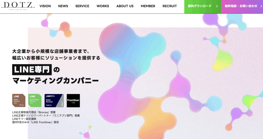 DOTZ株式会社は国内で唯一のLINE専門マーケティングカンパニーを掲げており、LINE正規取扱代理店Bronze、LINEテクノロジーパートナー「ミニアプリ部門」認定、さらにLINE Frontlinerを取得した代表のもとで400件を超えるアカウント運用実績を有しています