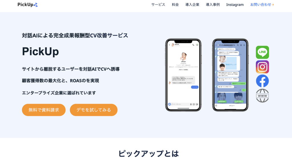 株式会社Capexの「PickUp」は、サイト離脱の予兆を検知してポップアップでLINEへ誘導し、対話AIチャットボットで疑問を解消しながら訴求を行いCVへ導く成果報酬型サービスです。初期費用と月額費用はかからず、CPA上限30万円までの従量課金上限制を採用しています。